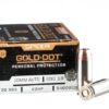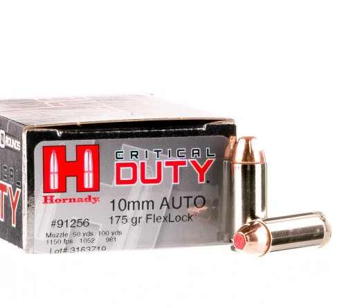This round defeats the threat with the power of its 175 grain FlexLock projectile. The jacketed hollow point gets its name from two of its performance-enhancing features: the Flex Tip polymer insert which shields its nose cavity against debris that could clog it, and the InterLock band which prevents excessive core/jacket separation during high-velocity penetration of barriers and soft tissue. These are both reasons why the FlexLock scores so splendidly during the FBI tactical handgun ammunition tests.