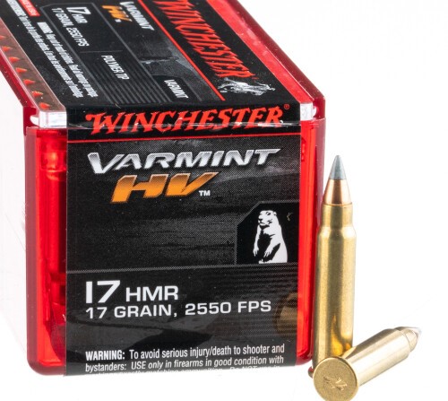 This 17 HMR from Winchester is a great choice for varmint hunting and plinking. It is outfitted with Hornady’s 17 grain, polymer-tipped V-Max bullet, which provides maximum expansion upon impact. And with a muzzle velocity of 2550 feet per second, this is a high velocity round which will quickly and accurately take down your favorite small game.