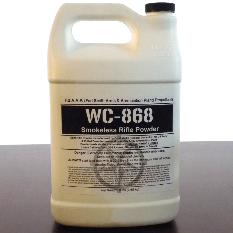 16 lbs of WC-868 smokeless double-base rifle powder packaged in two 8 lbs. UN 4G Rated Hazmat Jugs within a re-usable shipper kit. The jugs as shown are fully individually labeled for easy re-sale on store shelves. This military grade smokeless powder is a ball-style powder manufactured by Saint Marks (General Dynamics) for the US Army. It was pulled down in 2018 for the Fort Smith Arms and Ammunition Plant (FSAAP) at Lake City Army Ammunition Plant by certified Lake City & ATK Engineers. It has been certified for re-use, pressure, burn rate, accuracy, and unique lot numbers by both entities under ISO: 9001 standards before packaging for re-sale.